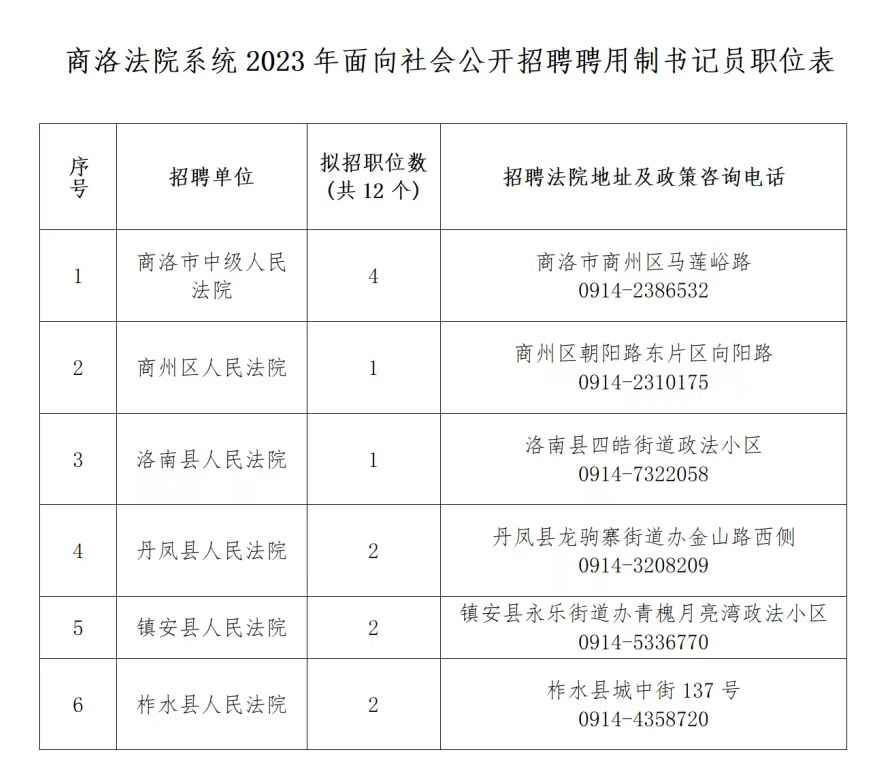 全市法院共招聘聘用制書(shū)記員12名,各法院招聘職位、地址及政策咨詢(xún)電話(huà)詳見(jiàn)《商洛法院系統(tǒng)2023年面向社會(huì)公開(kāi)招聘聘用制書(shū)記員職位表》(附件)。